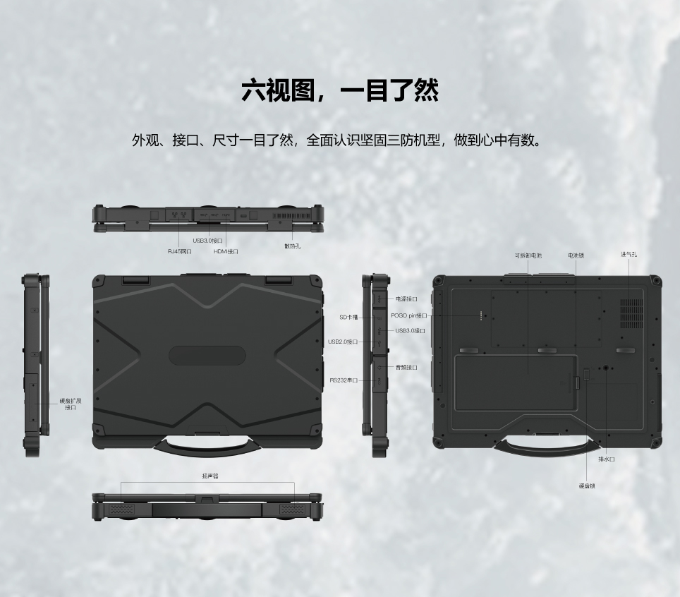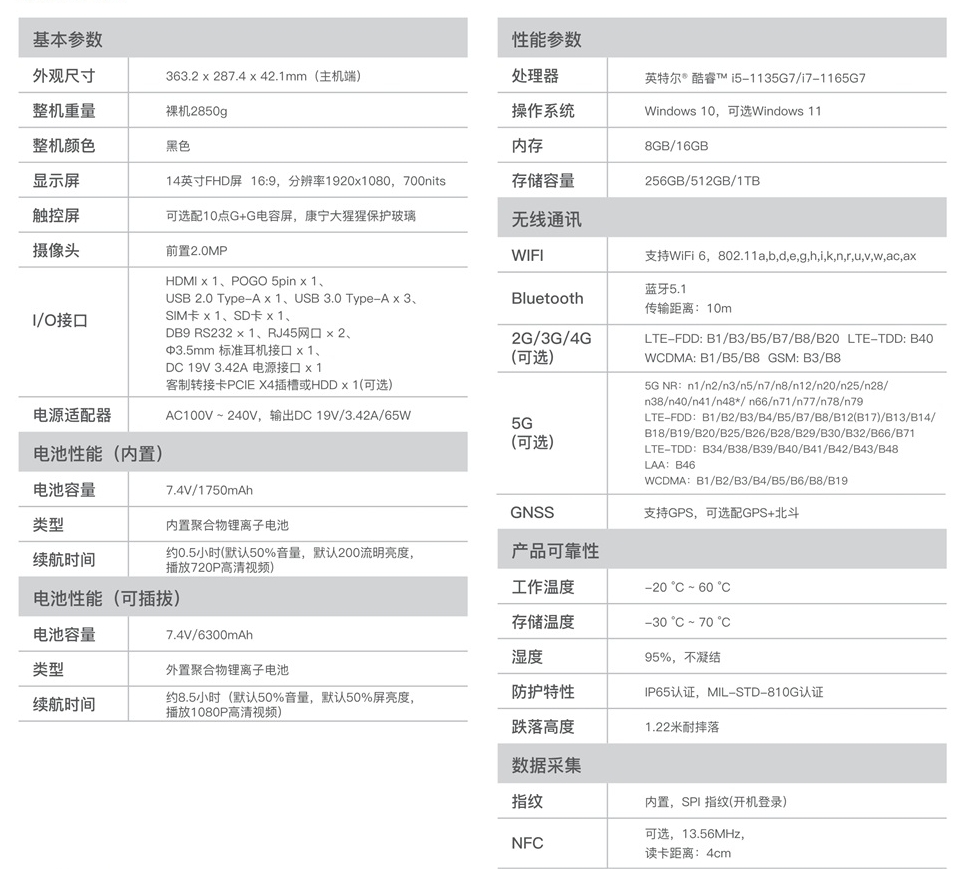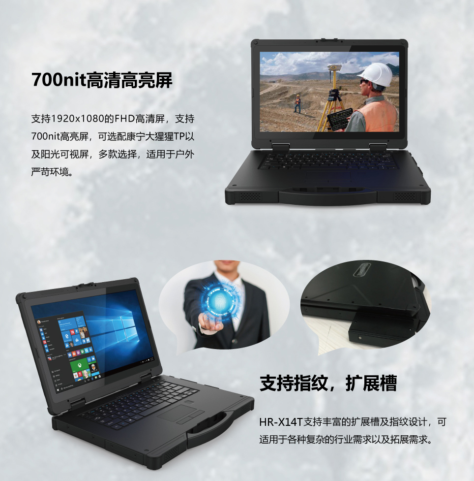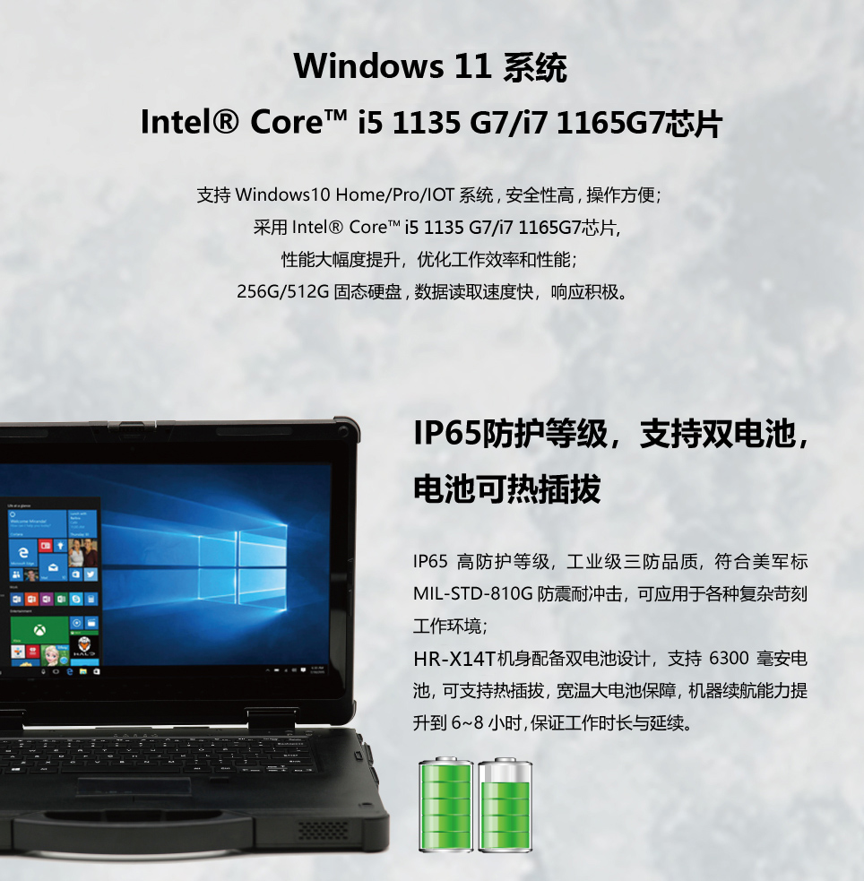 HR-X14T是一款高性能14寸加固平板电脑,采用最新11代英特尔酷睿I5 I7处理器,可搭载Windows10 Windows11操作系统,实力不容小觑。另外无线通讯支持WIFI6无线传输和蓝牙5 1,接口丰富,可以满足各种连接需求。 双电池设计,全力支持电池热插拔更换,续航无压力,高亮屏可以到700NIT满足户外应用场景的使用。